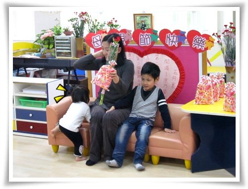 每個小朋友輪流向自己的媽媽,獻上康乃馨花束和各自親手做的小禮物。